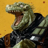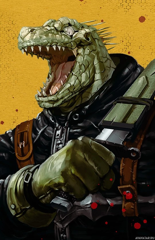 На картинке изображен фантастический персонаж с верхней частью тела крокодила и человекоподобной одеждой. Это существо, по-видимому, является мутантом, о чем свидетельствует его уникальное сочетание признаков, которые обычно не встречаются у людей или крокодилов. Он имеет острые зубы и носит какую-то броню или жилет, что может указывать на роль, связанную с боем или приключениями в фантастической обстановке. Персонаж, кажется, кричит или ревет с агрессивным выражением на лице.