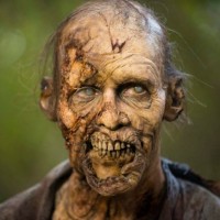 The image features a person with a heavily decayed and damaged appearance, suggesting they are depicted as a zombie. The skin is pale and appears to be rotting away in places, revealing bone or muscle tissue beneath. There are