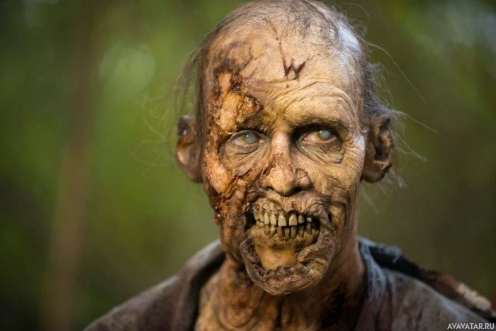 disheveled hair and their overall expression seems menacing or unnerving, which is consistent with how zombies are often portrayed in horror-themed media as being frightening and dangerous.