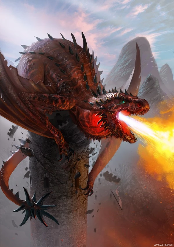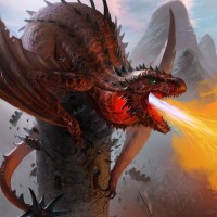 a fantasy scene featuring a dragon. The dragon appears to be in the midst of