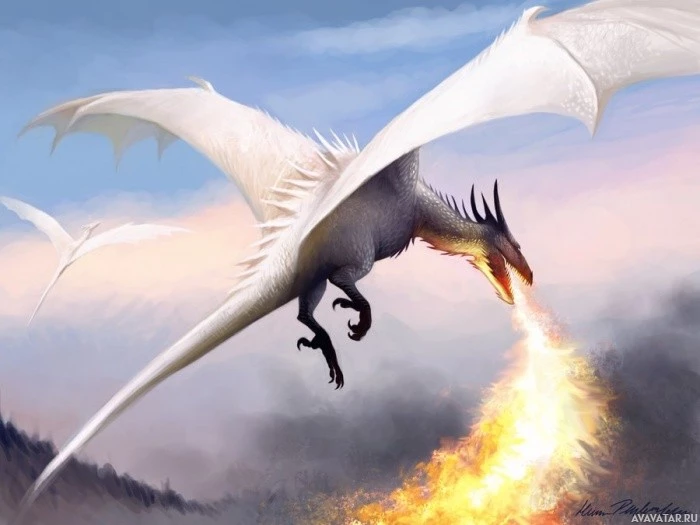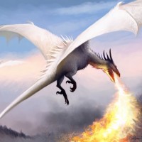 a fantastical scene with a dragon soaring in the sky. It appears to be breathing fire, which is a common ability attributed to dragons in mythology and fantasy genres. The background suggests