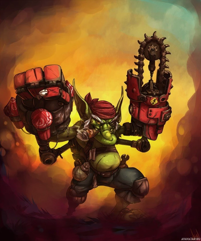 a goblin character. The goblin is holding a large, red and gold gun with two barrels in its hands, giving it an imposing appearance. It has a somewhat mischievous expression on its face and appears to be standing outdoors as there's