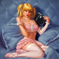 a female character with blonde hair styled in pigtails, wearing lingerie. She is lying on her stomach and appears to be reading a book. There's also a handbag visible near her. The art style suggests it might be an illustration from a comic or