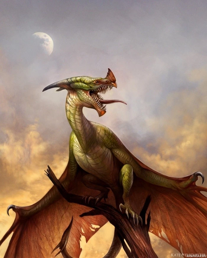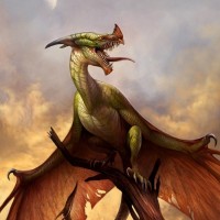 The image features a fantasy-style depiction of a dragon. It appears to be perched on a branch or limb, possibly as part of a tree or bush. The dragon has prominent scales,