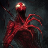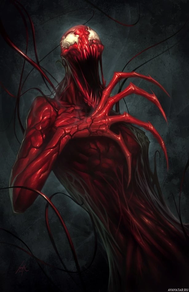 The image depicts a stylized artistic representation of a character known as Carnage. This character is often associated with the Marvel