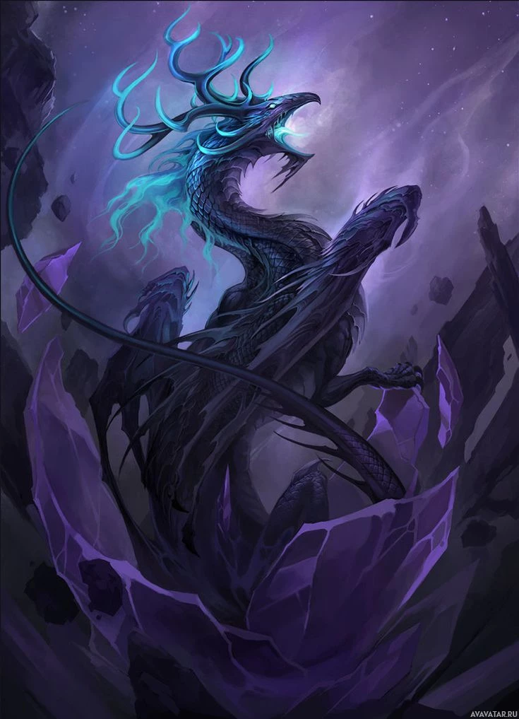 crystalline formations on its body, suggesting a magical or etherial aspect to the creature. Its expression is one of power or majesty. The dragon's skin tone is dark, possibly black or deep purple, and it stands against a backdrop that features