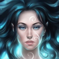 blue eyes, and her expression conveys a sense of calm or introspection. The background has a mystical quality, possibly suggesting