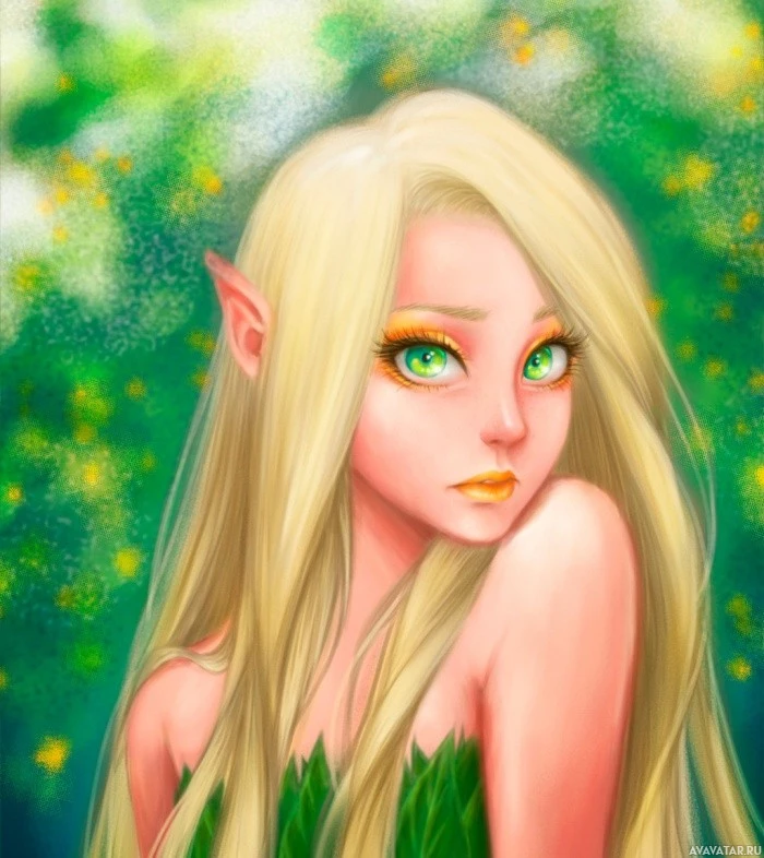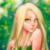 blonde hair, green eyes, and is wearing what appears to be a dress made out of leaves or foliage, giving the impression that she might have some sort of magical connection with nature. The background suggests a woodland setting with sunlight filtering through the trees. This kind of image would typically be associated with fantasy genres, where elves are often depicted as characters with