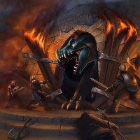 a group of knights who are either attacking it with their weapons or restraining it. The setting looks like an old ruin with