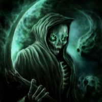 The image features an artistic representation of a figure often associated with death and the afterlife. This figure, which appears to be inspired by the Grim