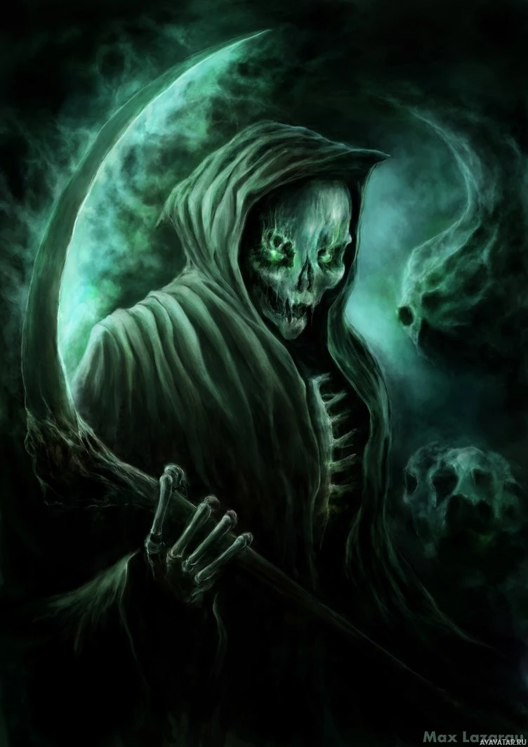 Reaper mythos, is holding a scythe in one hand and a skull in the other, symbolizing the harvesting or collection of lives. The figure is draped in