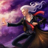 silver hair and appears to be in motion, possibly casting a spell or wielding some form of magic. They are wearing what looks like