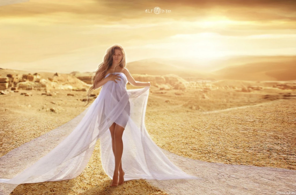 The image depicts a woman standing in what appears to be a desert setting at sunset or sunrise. She is dressed in a long, flowing