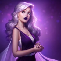 dark hair with purple highlights, giving her an ethereal or otherworldly appearance. She is wearing a long, flowing dress that appears to be purple with light-emitting designs or symbols on it. The background suggests a magical or fantastical setting with starry lights or glowing shapes behind her, contributing to
