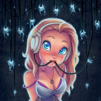 blonde hair. She is wearing headphones around her neck and there are wires that appear to be connected to her ears as if she has earbuds in them. Her expression is somewhat surprised or curious. The background suggests she might be in a room with