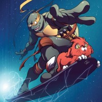 a red dog on his lap, both seemingly flying through the air due to some unseen force or propulsion method. The backdrop of the image suggests a cosmic or intergalactic setting, possibly indicating that Michelangelo and his pet are engaging in