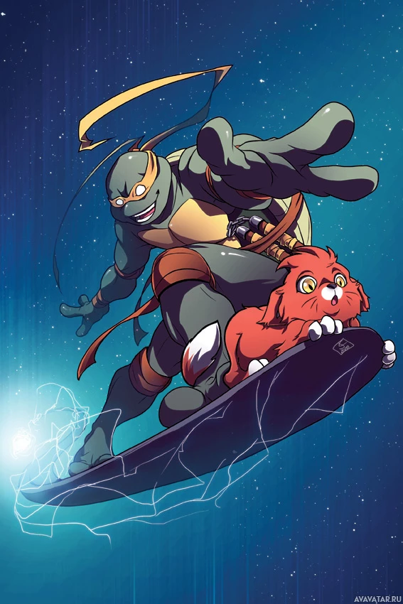 an animated character, Michelangelo from the Teenage Mutant Ninja Turtles franchise. He is riding a skateboard through space with