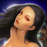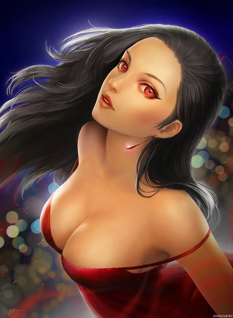 long hair and striking red eyes. She's wearing an elegant
