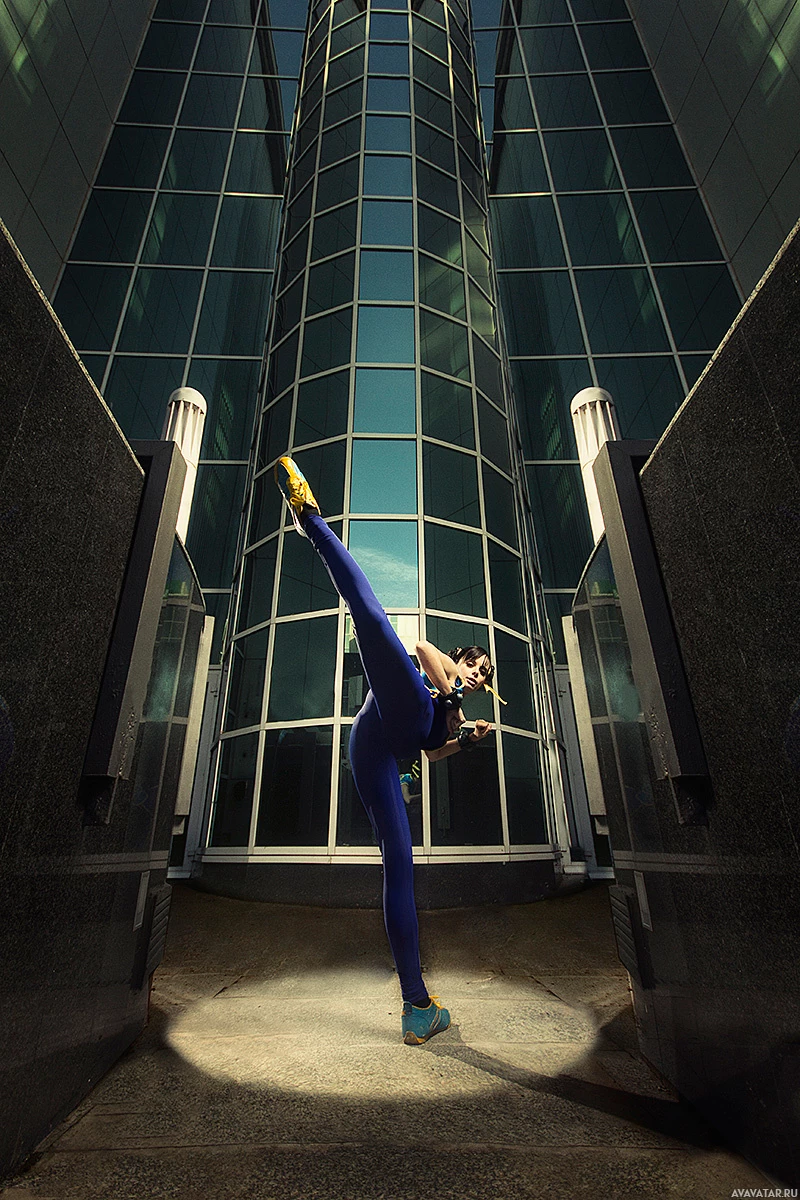 The image shows a person performing a leg kick, which could be interpreted as a pose that might resemble the character Chun-Li from the "Street Fighter"