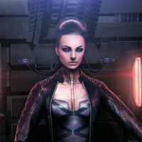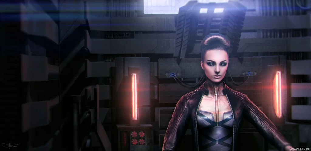 the science fiction genre. She is wearing a futuristic-looking outfit with a predominantly dark color scheme, which could suggest she might have a role in