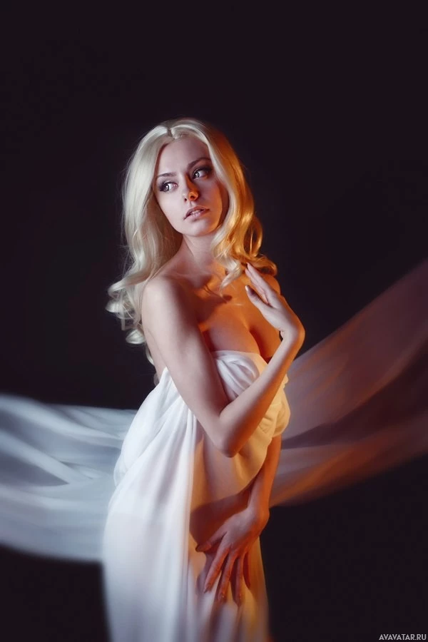 elegant gown flowing behind her, suggesting movement as if she is walking or dancing. Her makeup is done to enhance her eyes and lips, contributing to an ethereal and glamorous appearance. The lighting on the subject is soft and focused, highlighting her features and adding to the overall