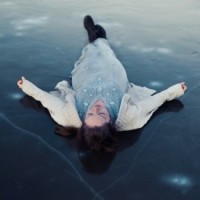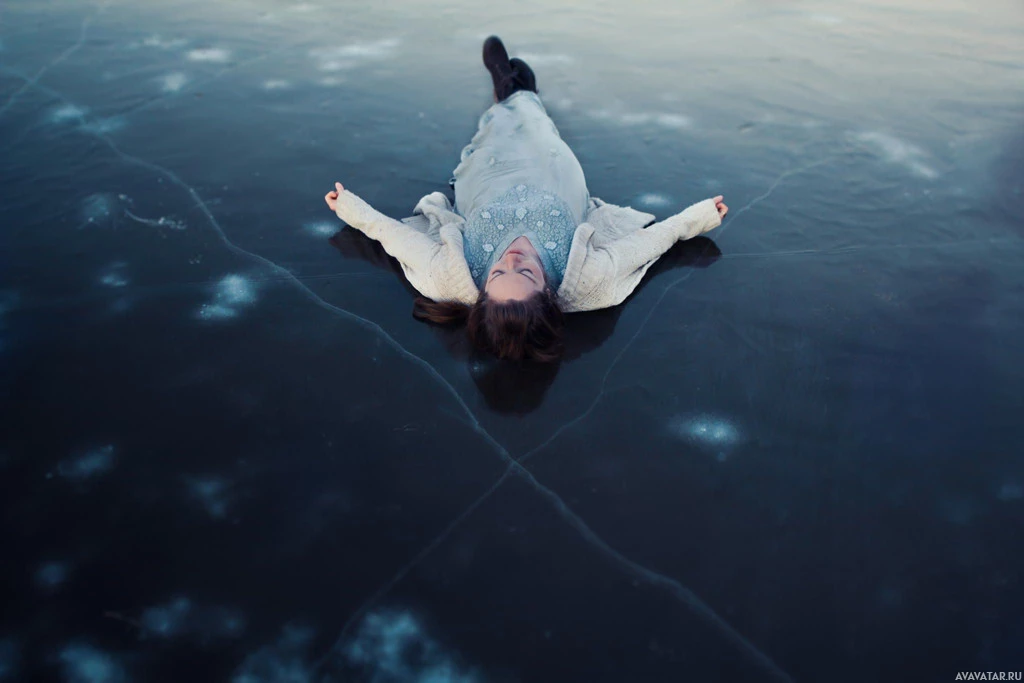 ice formations around her, suggesting that it might be cold outside and she's taking a moment to relax amidst this environment.