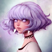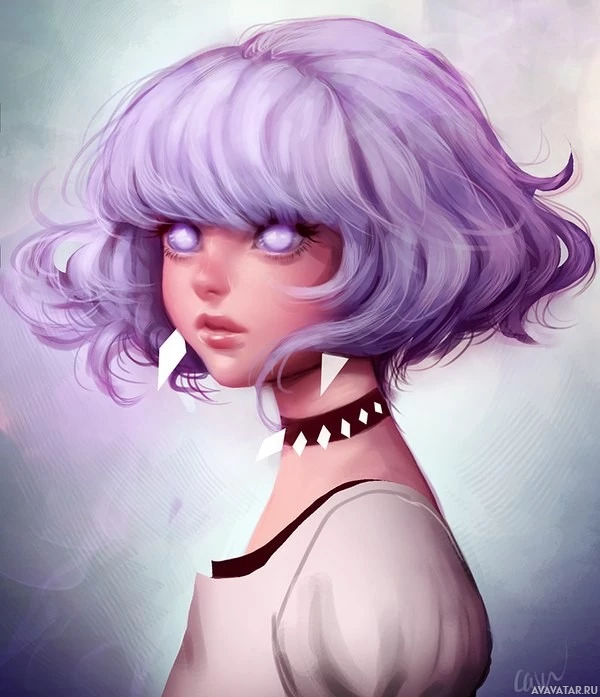 purple hair. She has large,