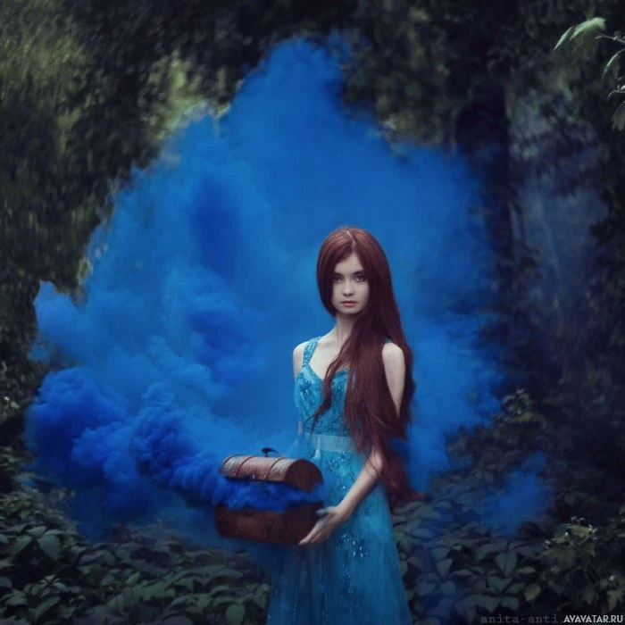 a treasure chest or a small box emitting blue smoke, which gives the impression of magic or enchantment. The setting seems to be outdoors in
