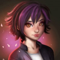 an animated character that appears to be a young girl with short purple hair and a simple expression. She is wearing what looks like a black jacket or shirt over