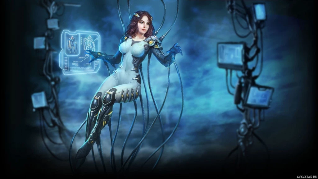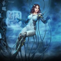 female character who appears to be in a science fiction setting. She has cyberpunk-like aesthetics with visible mechanical or electronic elements attached to her body and armor. There's also
