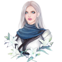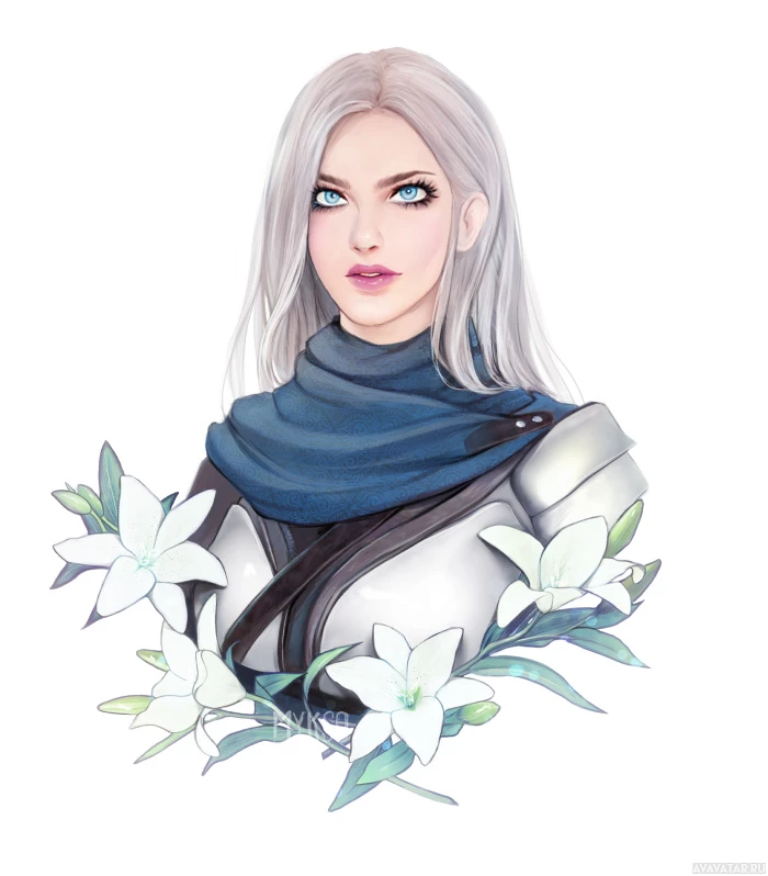 white hair, wearing what appears to be armor and holding a blue scarf or fabric around her neck. She has