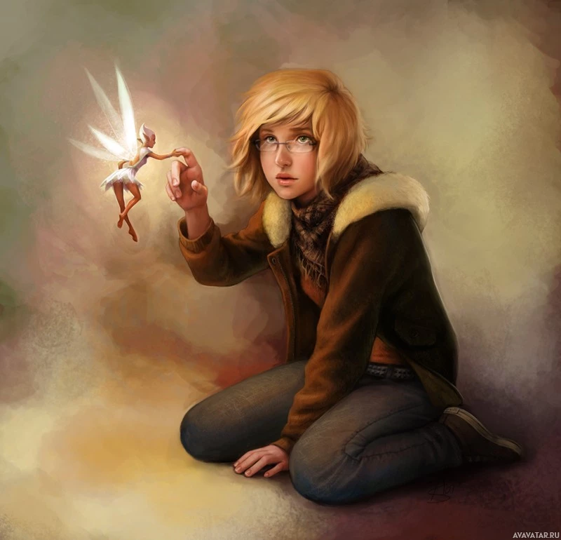 blonde hair and glasses. She is sitting on the ground, holding what appears to be a fairy in her hand, suggesting she might have just magically conjured it or found it. Her expression seems surprised or amazed, indicating this event may not be commonplace for her character. The style of the image is reminiscent of fantasy illustrations, with