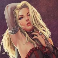 a young woman with blonde hair. She has a somewhat ethereal or fantasy-like appearance, wearing what looks like armor or battle attire with red and black accents, suggesting she might be from