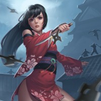 a young girl with black hair and is dressed in traditional Japanese clothing. She wields two knives and appears to be in the middle of performing