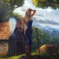 blonde hair. She is standing in front of a rustic cottage, looking back towards the viewer. She has a thoughtful or contemplative expression on her face and seems to be holding a stick in her hand. The setting suggests a peaceful countryside environment, possibly in a fantasy or fairy tale context.