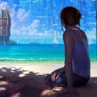 a female character sitting on a beach. She appears to be looking out at the sea, where there is a large