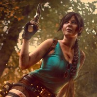 The image features a woman dressed in what appears to be the costume of Lara Croft, a character from a popular