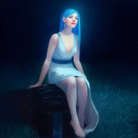 classical attire, which could suggest a fantasy or historical theme to the image. The environment around them is dark and shadowed, with trees and grass visible, giving the impression that it might be nighttime.