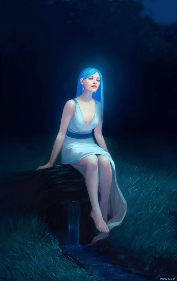 blue hair, sitting on the edge of a grassy area or a bank. They appear to be in