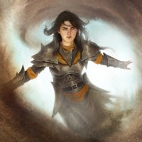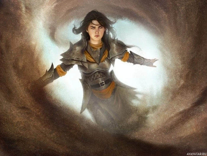 a fantasy setting. Her expression and posture convey intensity and focus. The background has a mystical or magical appearance, with