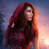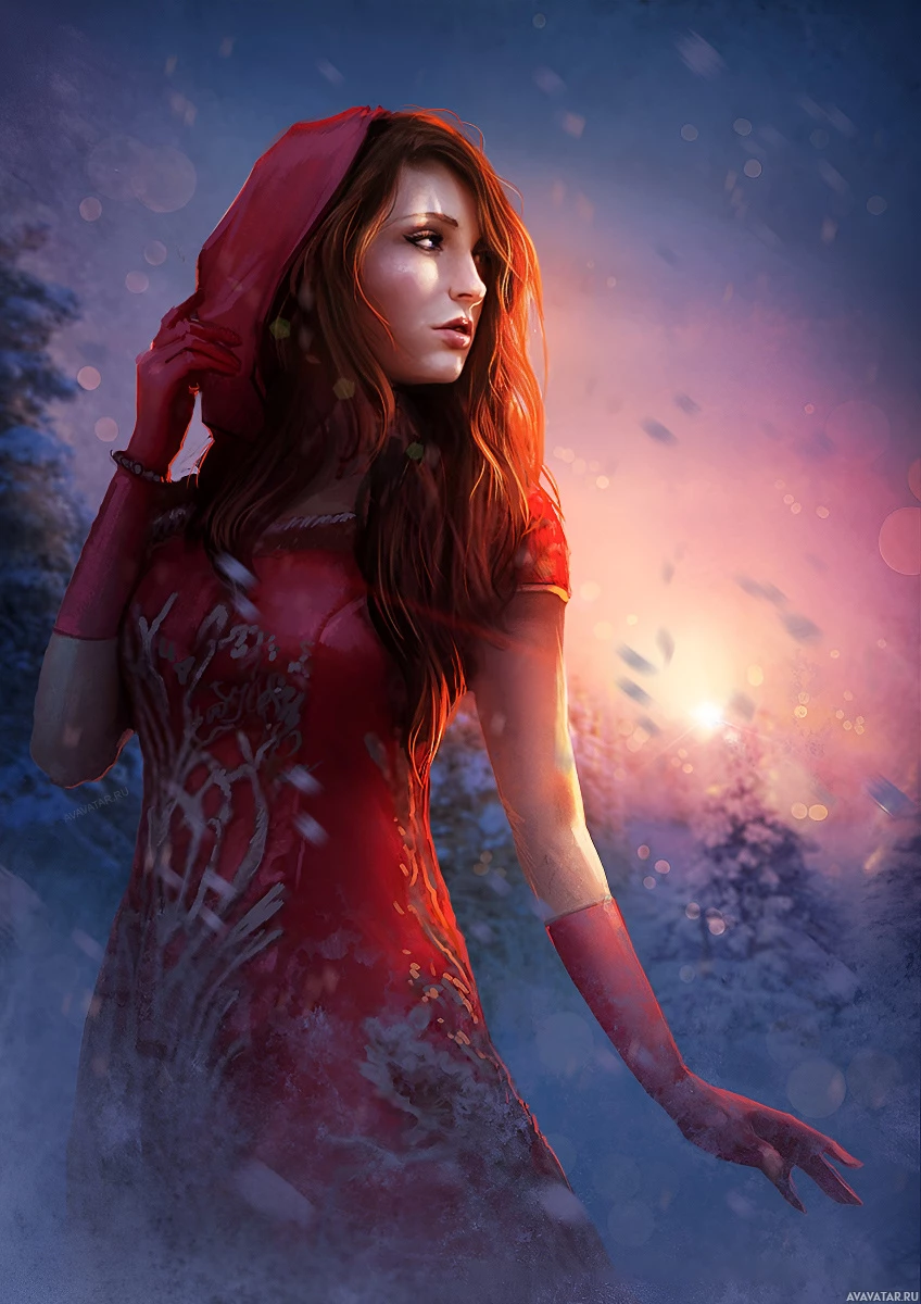a young woman with red hair wearing a vibrant red dress that stands out against the snowy landscape. She appears to be looking off into the distance, possibly towards an approaching light or something intriguing in her