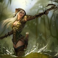 a fantasy setting. In one hand, she is holding a crossbow, which is pointed forward, ready for firing. The environment around her is misty with the appearance of