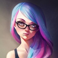 multicolored hair, predominantly blue and pink, with some green highlights. Her expression is neutral to slightly concerned, with