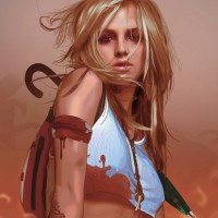 a barren landscape with fire, suggesting a post-apocalyptic or desolate setting. The artwork has a dynamic feel, with the figure posed in