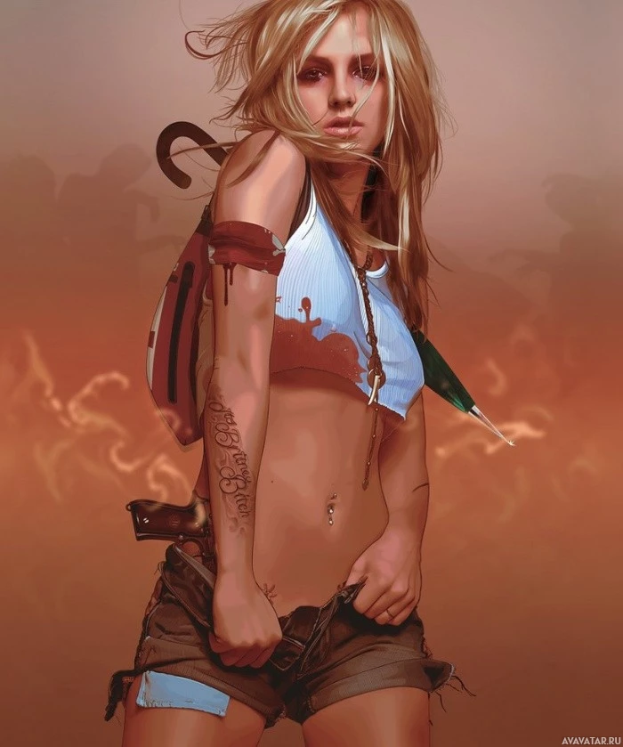 blonde hair, wearing denim shorts, a tank top, and holding what appears to be a walkie-talkie or communication device. The background features