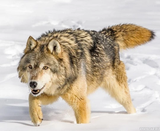 a snowy environment. The wolf appears to be walking through