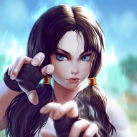 an animated character, a female with brown hair, wearing boxing gloves. She has a determined expression on her face and is holding out one hand as if gesturing towards something or someone. The background suggests she might be in