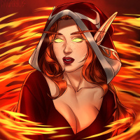 a serious expression on her face, with eyes that have an unusual yellowish glow around them. Her attire suggests she might be from a fantasy setting where such creatures exist, possibly representing a mystical or magical character within the context of this image. The background consists of fiery oranges and yellows, which could imply some sort of