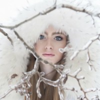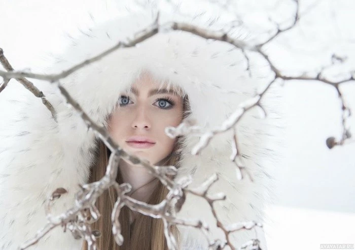 На снимке изображена молодая женщина со светлой кожей и длинными волосами, одетая в меховой капюшон, который покрывает ее голову. Она смотрит прямо в камеру, и на ее капоте и земле вокруг нее виден снег. За ней голые ветви деревьев, что говорит о том, что она может находиться в холодном или зимнем климате. Ее наряд указывает на то, что на улице довольно прохладно.