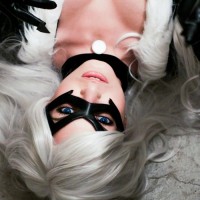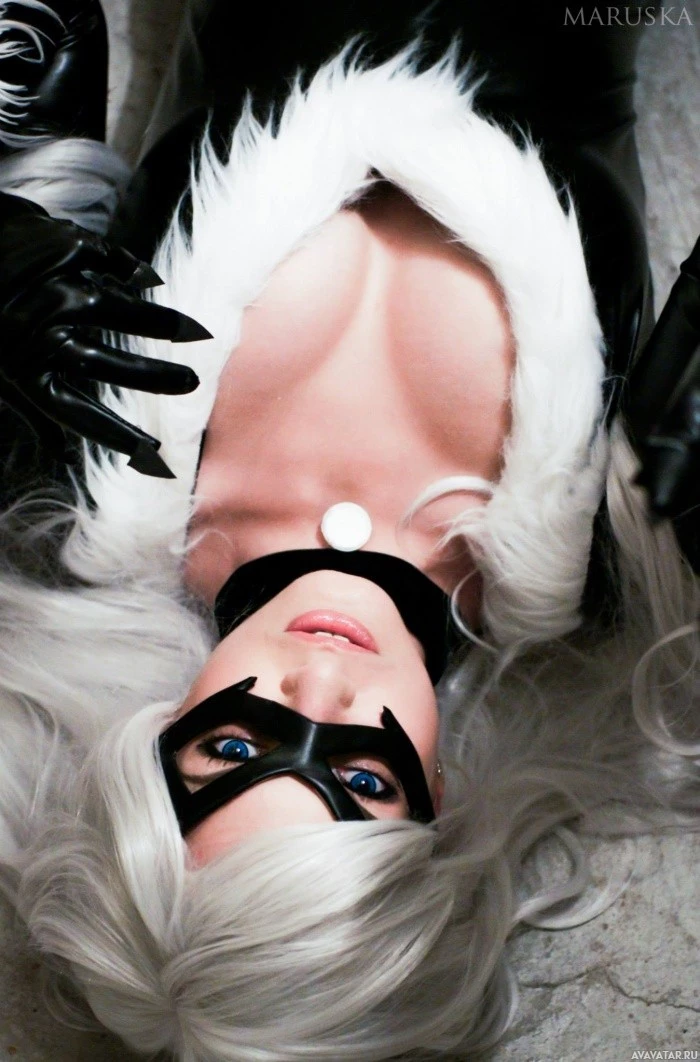 The image shows a person in a cosplay of Black Cat,